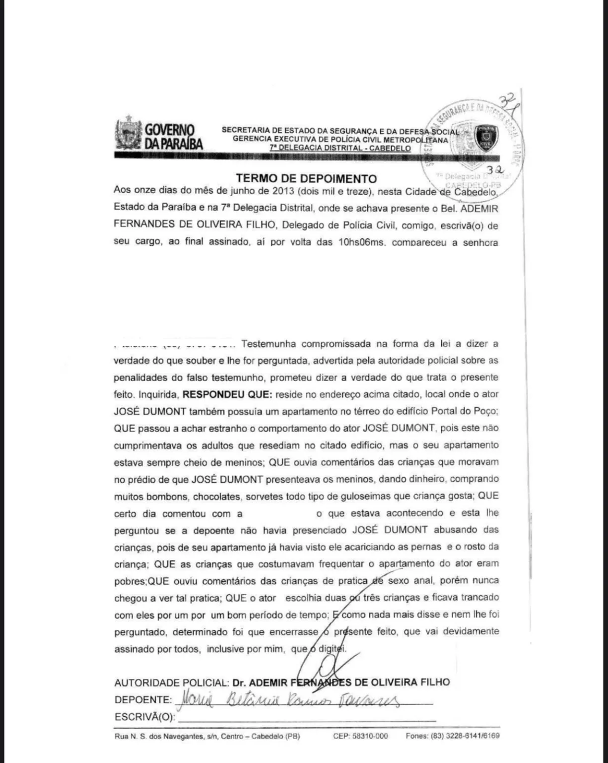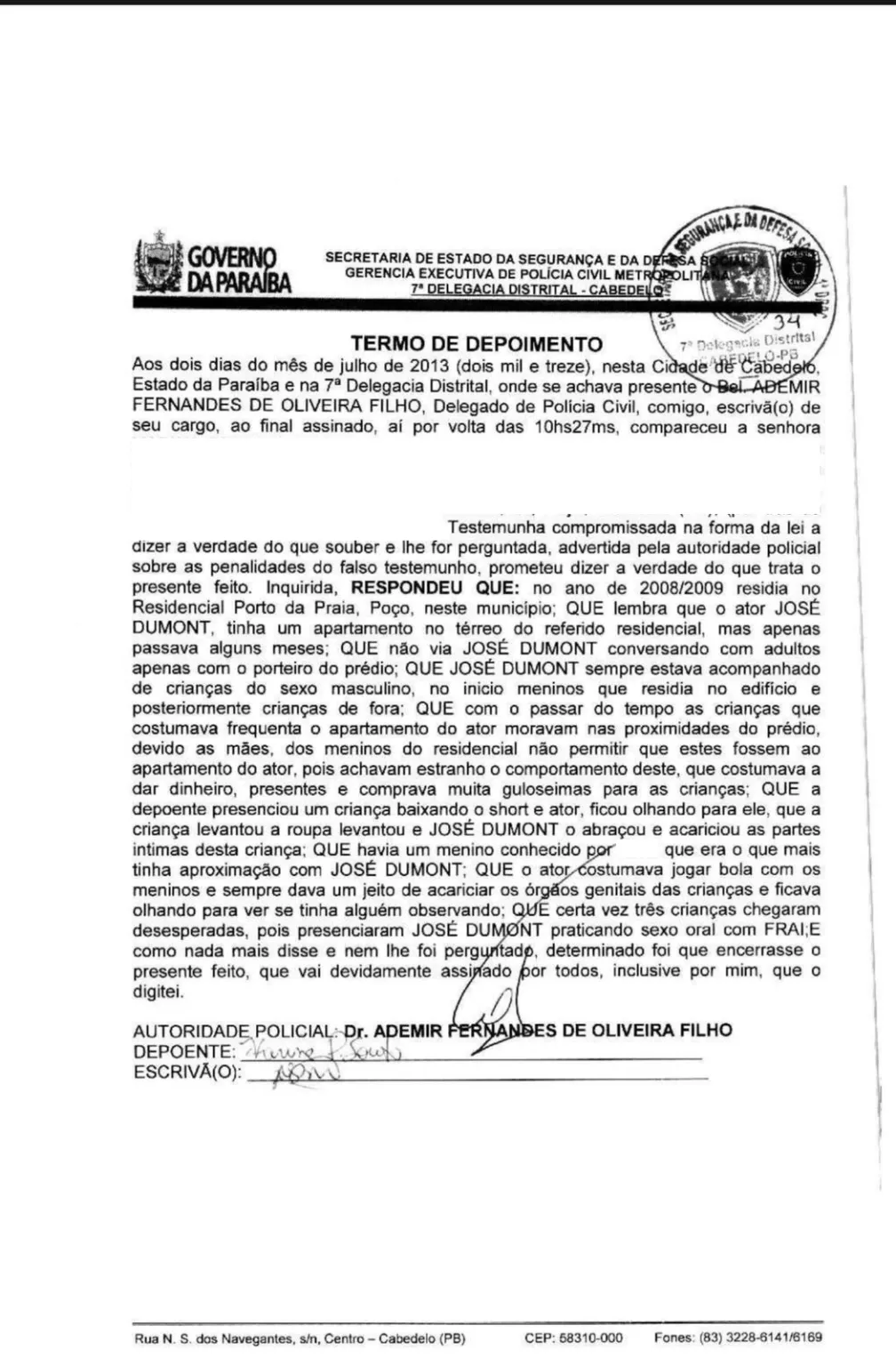 Nele, a depoente revelou que presenciou uma criança abaixando o short para o ator e que José costumava jogar bola com as vítimas e “sempre dava um jeito de acariciar os órgãos genitais […] e certa vez três crianças chegaram desesperadas, pois presenciaram JOSÉ DUMONT praticando sexo oral” com um menino que foi considerado pela denunciante como a mais próxima do artista.