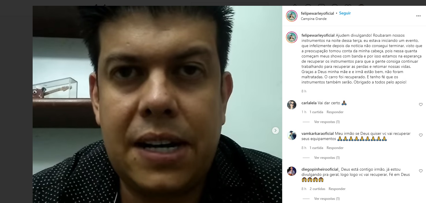 Vejam o apelo do cantor: “Ajudem divulgando! Roubaram nossos instrumentos na noite dessa terça, eu estava iniciando um evento, que infelizmente depois da notícia não consegui terminar, visto que a preocupação tomou conta da minha cabeça, pois nessa quanta começam meus shows com banda e por isso estamos na esperança de recuperar os instrumentos para que a gente consiga continuar trabalhando para recuperar as perdas e retomar nossas vidas. Graças a Deus minha mãe e e irmã estão bem, não foram maltratadas. O carro foi recuperado. E tenho fé que os instrumentos também serão. Obrigado a todos pelo apoio!”, disse o cantor ao destacar que os equipamentos são para seu trabalho diário.