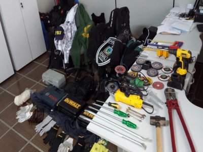 Além disso, os agentes encontraram também uma grande variedade de equipamentos utilizados em arrombamentos de cofres, tais como: serras, furadeiras, pés de cabra, torquês e luvas.
