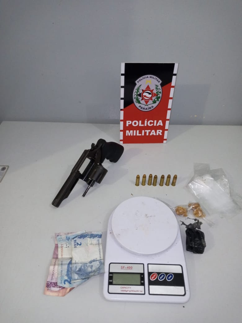 A Polícia Militar apreendeu um revólver, munições, balança de precisão e drogas dos tipos maconha e crack, nessa segunda-feira (19), durante o reforço das rondas na comunidade Porto da Oficina, no bairro do Sesi, em Bayeux. Um suspeito de 19 anos, que estaria atuando no tráfico, foi preso na ação.