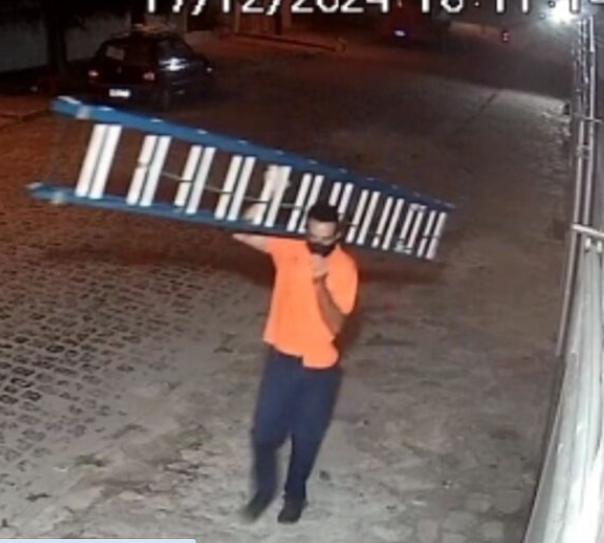 As imagens mostram o momento em que o suspeito, carregando a escada sobre o ombro, caminha pela rua. De acordo com as informações, o furto levou apenas dois minutos para ser consumado.