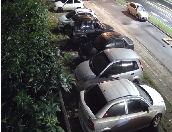 Nas imagens é possível ver que ele tanta enxergar o que tem dentro do veículo e encoberto pelo carro em que chegou, realiza movimentações suspeitas.