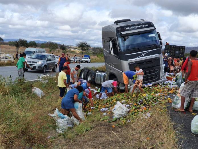 Parte da carga de frutas que era transportada por um caminhão que tombou na manhã desta quinta-feira (30), na BR-230 sentindo Campina Grande – João Pessoa, foi levada por moradores da região logo após o acidente.