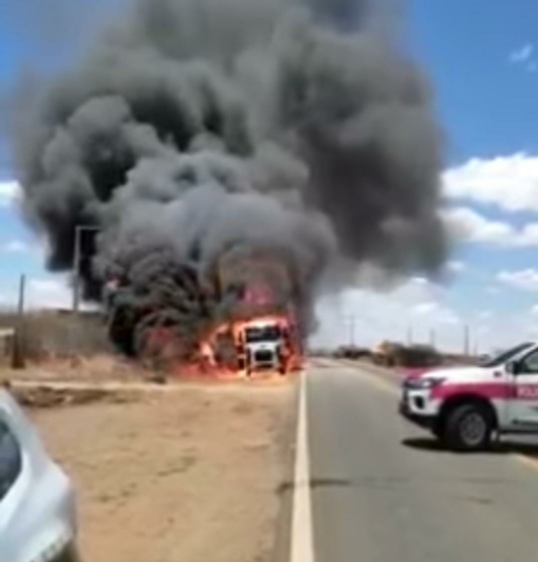 Uma carreta ficou destruída após pegar fogo na manhã desta terça-feira (16) nas proximidades de uma loja Maçônica, na BR-412 em Monteiro, no Cariri da Paraíba.