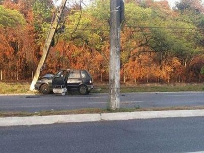 Por pouco o poste não tombou com o impacto da batida. A parte frontal do carro, de modelo Fiat Uno, ficou bastante danificada.