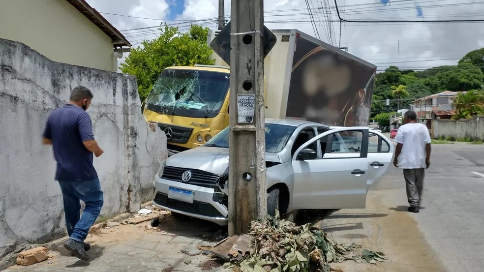 De acordo com as informações o motorista teria perdido o controle o caminhão após colidir com um carro de passeio. O carro ficou preso entre o caminhão e um poste.
