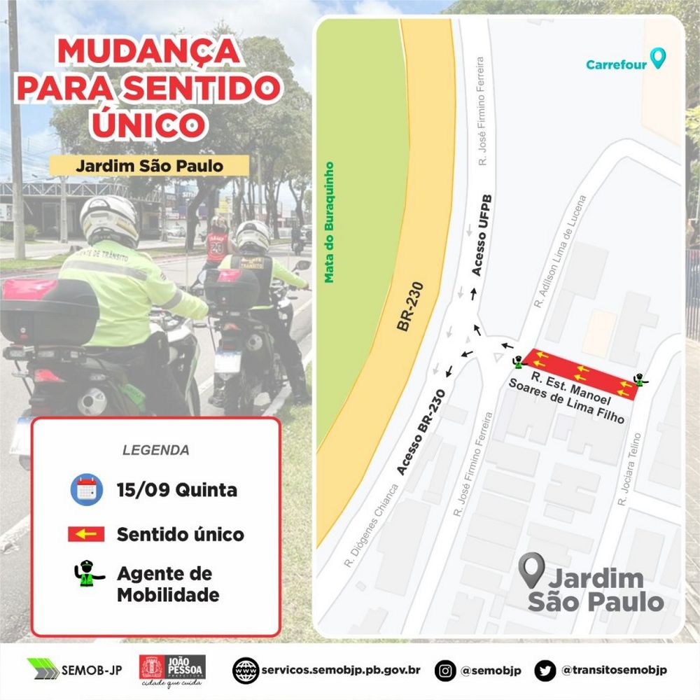 A Superintendência Executiva de Mobilidade Urbana (Semob-JP) por meio de comunicado informou que vai alterar a partir desta quinta-feira (15), o sentido da circulação de veículos na Rua Estudante Manoel Soares de Lima, localizada no bairro Jardim São Paulo, na Zona Sul de João Pessoa.