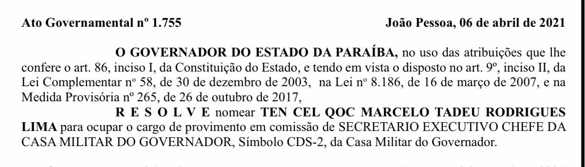 Saiu na edição desta quarta-feira (07), do Diário Oficial do Estado (DOE), a exoneração do coronel da Polícia Militar, Anderson Henriques Benevides Pessoa, da chefia da Casa Militar do Governador.