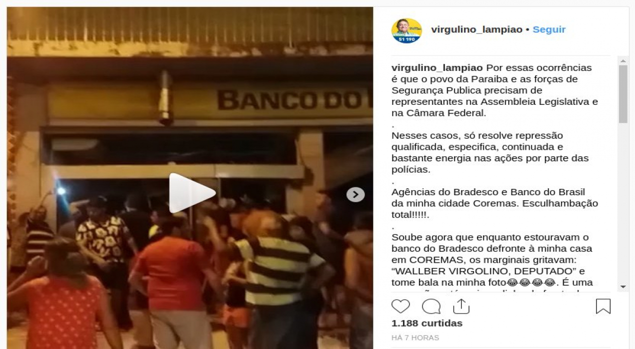 “Soube agora que enquanto estouravam o banco do Bradesco defronte à minha casa em Coremas os marginais gritavam: Wallber Virgolino, deputado. E tome bala na minha foto. É uma pena não está mais na linha de frente da Segurança Pública da Paraíba, a resposta seria dada à altura, mas…”, contou o delegado.