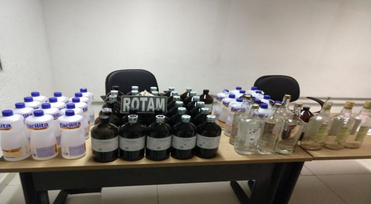 Foi quando os policiais resolveram entrar na residência, pois acreditavam ter algo ilícito para justificar a fuga dos dois suspeitos. No local eles encontram treze garrafas de álcool, seis garrafas de tricloroetileno e 25 garrafas de clorofórmio que juntos fazem o loló.