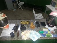 Com os acusados, a polícia apreendeu um revólver, duas facas, dois celulares, três capacetes, e o valor de R$ 1.080 , além de vários cartões de créditos.