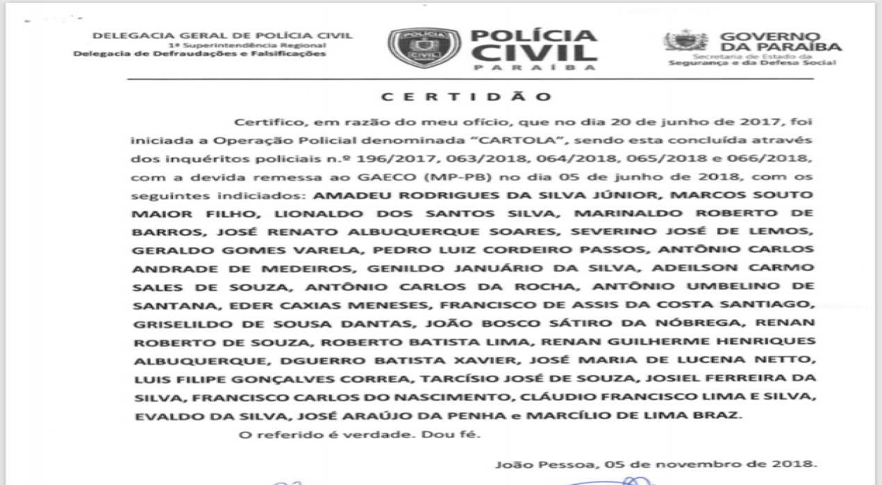 Conforme aponta certidão (anexo) assinada pelo delegado João Ricardo M. M. da Franca Júnior, da Delegacia de Defraudações e Falsificações, e pelo escrivão Durval Balbino dos Santos Neto, emitida neste dia 5 de novembro de 2018, as investigações da Operação Cartola na Paraíba foram iniciadas no dia 20 de junho de 2017 e foram devidamente concluídas em junho de 2018, resultando nos inquéritos de números 196/2017, 063/2018, 064/2018, 065/2018, 066/2018, devidamente encaminhados ao Ministério Público Estadual, por meio de ofícios assinados à época pelo delegado Lucas Sá, então titular da DDF em João Pessoa.