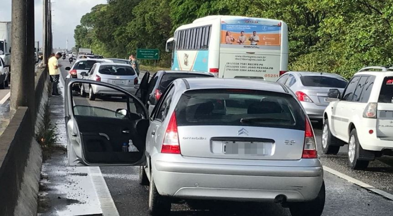 O trânsito começou com transtorno após um engavetamento envolvendo 16 carros nesta quinta-feira (18), na BR-230, em João Pessoa, próximo a uma universidade particular, com fluxo no sentido do município de Bayeux.