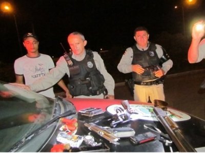 Durante a revista feita no interior do veiculo, os policiais encontraram uma escopeta calibre 12, uma pistola 9 mm, um revolver calibre 38 e 10 munições calibre 12.