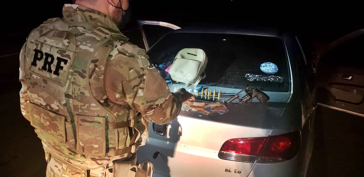 Após busca minuciosa foram localizadas no veículo R$338 e um aparelho telefônico que haviam sido roubados do frentista do posto que foi assaltado. Também foram apreendidos quatro pinos de cocaína cheios, 6 pinos vazios com resquício de cocaína e 5 munições que estavam no bolso de um dos indivíduos. Buscas foram realizadas no local onde foi arremessada a arma de fogo. Equipe da PRF encontrou um revólver calibre. 38 com 6 munições intactas. Funcionários do estabelecimento que foi assaltado reconheceram os indivíduos como autores do crime confirmaram que o veículo abordado pelos policias foi utilizado durante a ação.