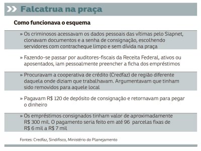 Não levaram o dinheiro porque funcionários da Cooperativa de Crédito Mútuo do Servidor Federal (Credfaz) desconfiaram da operação e denunciaram a fraude. De acordo com Nelson Pessuto, diretor de crédito da Credfaz, neste ano foram identificados quatro casos, com três servidores ativos e um aposentado, entre agosto e setembro. Os bandidos estavam bem articulados. Foram, presencialmente, à cooperativa de regiões diferentes das que supostamente trabalhavam, sob o pretexto de que haviam sido transferidos.