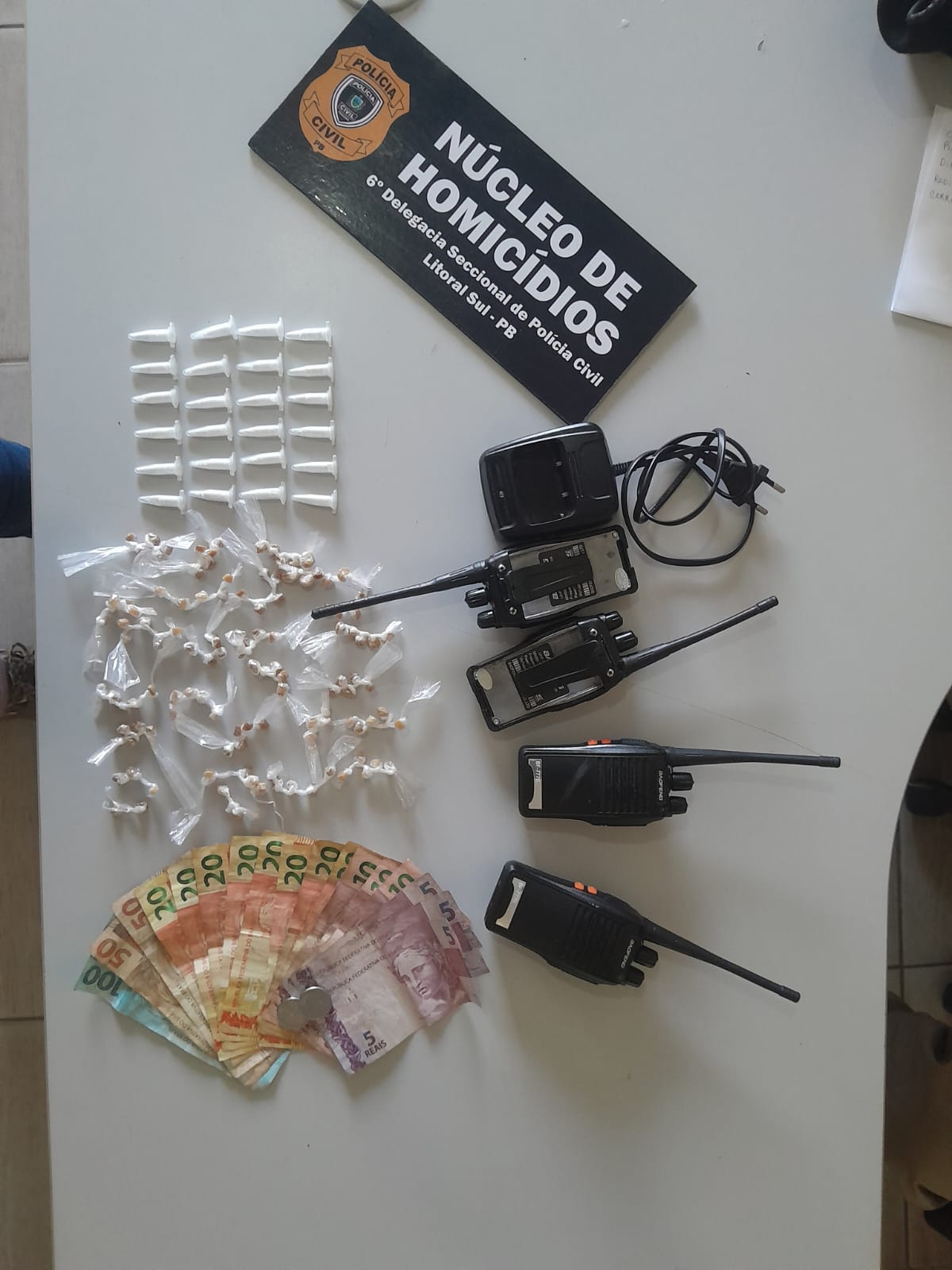 Ele estava com 122 invólucros plásticos contendo substância amarelada semelhante a crack, 24 microtubos contendo substância em pó semelhante a cocaína, 04 radiocomunicadores portáteis e R$ 406,00 em espécie, ensejando a autuação do foragido pelo crime de tráfico de drogas.