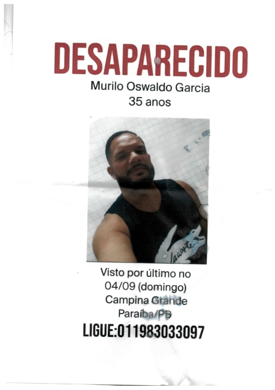 Um homem desapareceu esta semana em Campina Grande, e a família que reside em São Paulo está aflita em busca de informações que levem a encontrá-lo. Murilo Oswaldo Garcia de 35 anos, veio trabalhar em Campina há cerca de dois meses e estava hospedado na casa de um amigo em Vila Cabral de Santa Terezinha.