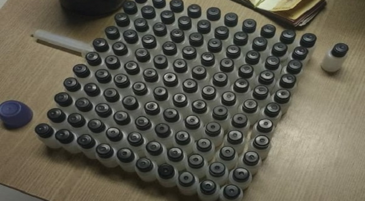 Com ele a polícia encontrou cerca de 111 frascos para fracionar entorpecente além de uma garrafa contendo a droga, conhecida popurlamente como loló.