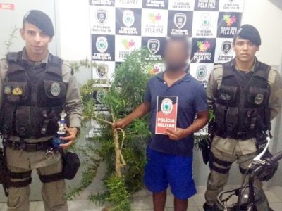 De acordo com os policiais do 7º Batalhão, uma equipe fazia rondas próximo ao cemitério da cidade quando se deparou com o suspeito, que tentou jogar uma sacola ao perceber a chegada da polícia. Ele foi abordado e os policiais encontraram dentro da sacola várias porções de maconha. Na casa do suspeito, a polícia apreendeu o restante do material, incluindo a planta.