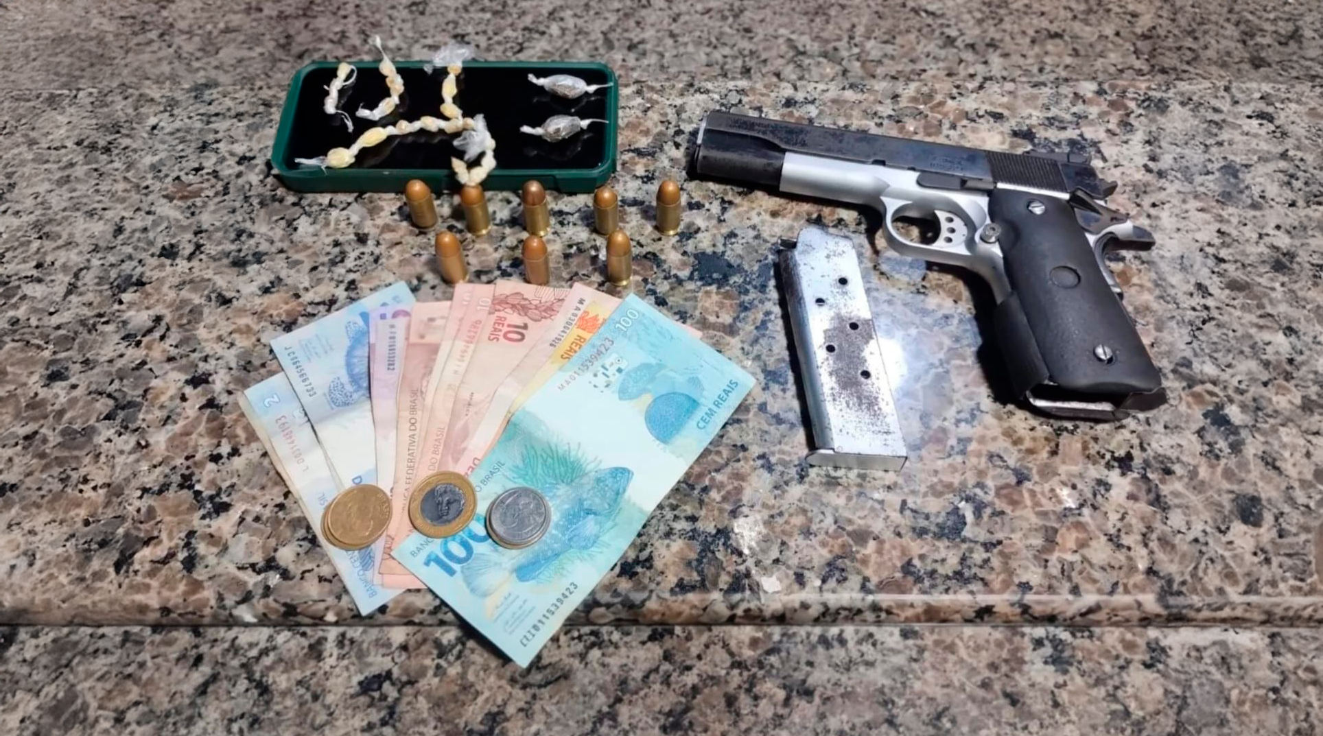 Durante rondas na cidade de Juripiranga-PB, os policiais receberam informações de populares que um homem estaria em atitudes suspeitas em uma área conhecida pela disputa do tráfico local. Rapidamente, a equipe policial interceptou o suspeito e com ele foram apreendidos: 01 pistola, calibre .45, com 08 munições intactas; 20 porções de crack; 02 porções de maconha; e R$ 201,75 reais, em espécie.