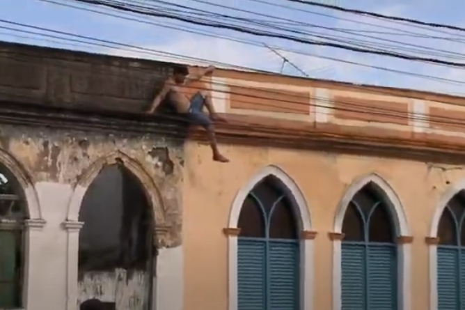 Uma cena inusitada chamou a atenção no Centro Histórico de João Pessoa nesta sexta-feira (10). Um homem identificado como Tomaz Almeida da Silva foi avistado escalando a fachada de um casarão antigo na Avenida General Osório, próximo ao Pavilhão do Chá, em uma tentativa de escapar de um grupo que o perseguia com intenção de linchamento.