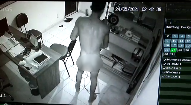 Um dado chama a atenção nas imagens do circuito de monitoramento da loja, é que o homem aparece invadindo o local completamente nu. O roubo aconteceu na madrugada desta segunda-feira (24).