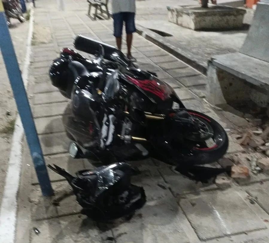A moto e um banco aparentemente de uma praça onde provavelmente a senhora estaria sentada, ficaram destruídos com o impacto da colisão.