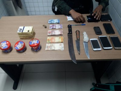Outra ação da PM – por volta das 19h30, também no Castelo Branco, uma equipe do BPAmb abordou um veículo Corsa Classic onde estavam 5 homens, que demonstraram nervosismo quando viram os policiais. Após a busca foi constatado que eles haviam acabado de assaltar uma farmácia na Avenida Beira Rio, em João Pessoa. Com eles foram apreendidos um facão, duas facas, cinco telefones celulares e mais de mil e seiscentos reais em dinheiro. Dentre os suspeitos, dois são menores de idade.