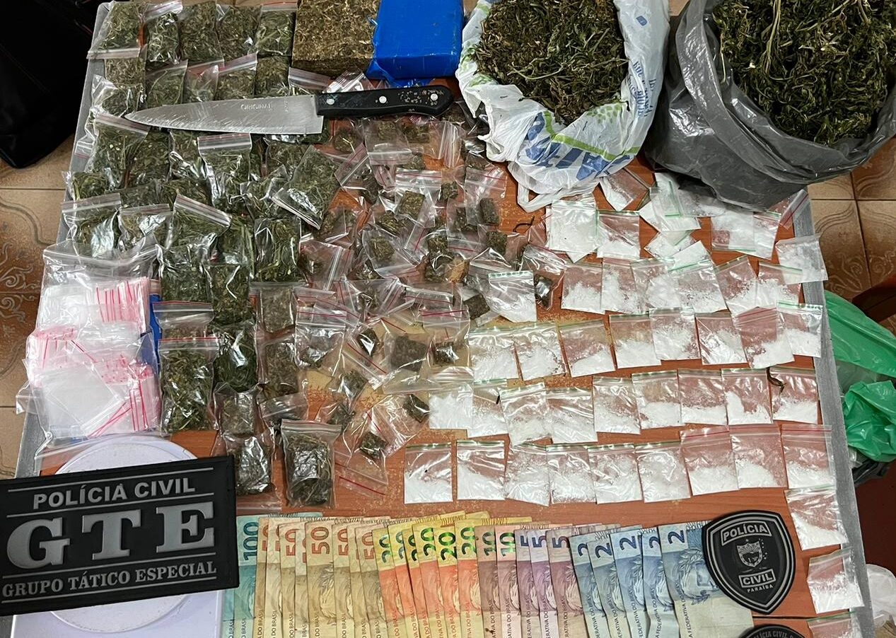 Durante as diligências, os policiais apreenderam mais de 100 porções de maconha e cocaína já embaladas para comércio, além de quantidades maiores em duas sacolas. Dinheiro fracionado e uma balança de precisão também foram apreendidos.