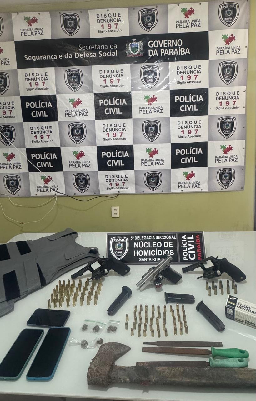 Durante as diligências, os policiais apreenderam uma pistola calibre 380, um revólver calibre 38 e 97 munições, além de um colete balístico e armas brancas. Todo o material será analisado e encaminhado à justiça.