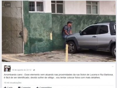 “Arrombando carro – Esse elemento vem atuando nas proximidades da rua Solon de Lucena e Rui Barbosa, é fácil de ser identificado, devido sofrer de vitiligo , vou tentar colocar fotos com mais detalhes”, diz a postagem.