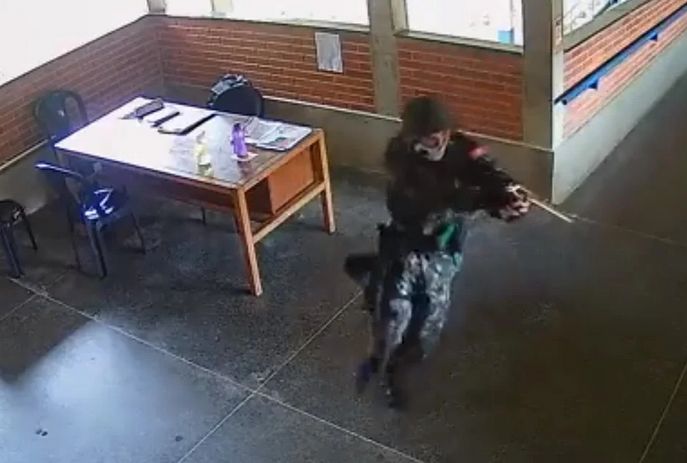 Imagens das câmeras de segurança registraram a ação. O atirador vestia roupa camuflada e uma máscara de esqueleto, similar à usada em fotos nas redes sociais por um dos autores do massacre ocorrido em 2019 na Escola Estadual Raul Brasil, em Suzano, São Paulo.