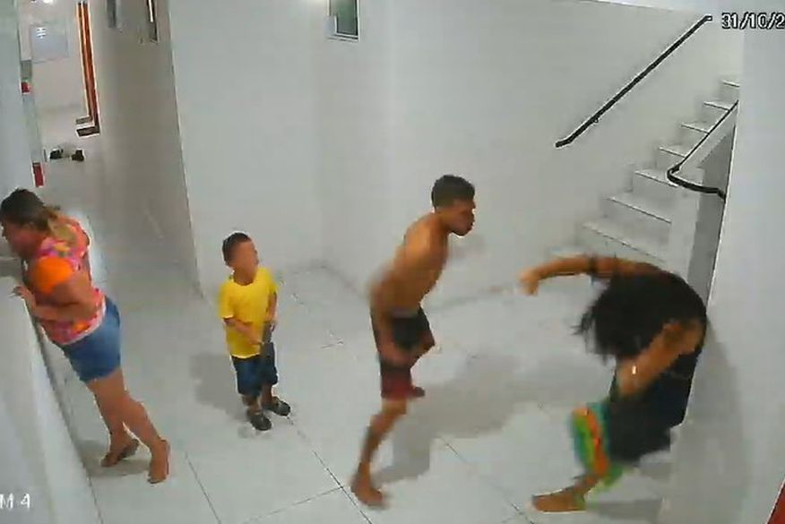 Apesar dos pedidos de socorro da outra mulher, o agressor continua atacando impiedosamente a vítima. Mesmo a criança, em um ato de coragem diante da situação desesperadora, tenta intervir para impedir as agressões.