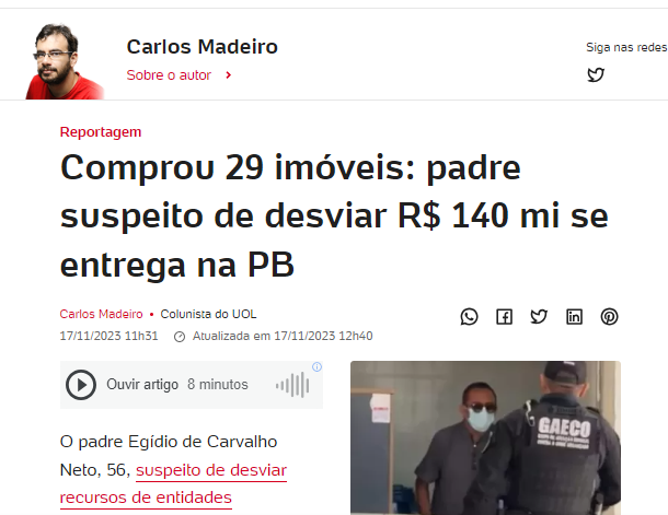 O portal UOL trouxe, em sua cobertura nacional, o escândalo que abalou as estruturas da Igreja na Paraíba. O padre Egídio de Carvalho Neto, de 56 anos, entregou-se à polícia nesta sexta-feira (17) em João Pessoa, após o Tribunal de Justiça da Paraíba expedir um mandado de prisão contra ele.