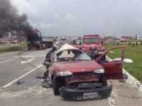 A jovem que morreu nesta quarta-feira estava grávida à época do acidente e perdeu o bebê na colisão. Segundo as informações repassadas pela Polícia Rodoviária Federal (PRF), o caminhão bateu na traseira do carro em que seguiam as pessoas que morreram na colisão. Na batida, a cabine do carreta pegou fogo.