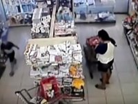 Todo o material que estava no carrinho foi escondido na sacola da mulher. Enquanto isso, a criança brinca entre dois corredores correndo em círculos, sem perceber a atitude da mulher, que não se sabe ao certo se seria a mãe.