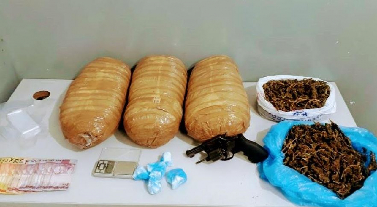 Diante do fato, os policiais, ao fazerem uma busca detalhada na residência, onde foi lançado o invólucro, encontraram outros materiais ilícitos, como: 6 kg de maconha, 180g de cocaína, uma balança de precisão, dinheiro e um revólver, calibre 38.