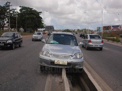 No momento da ultrapassagem, o motorista do Honda Civic não teve como reduzir a velocidade e subiu no canteiro central da BR.
