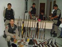 Residência de um dos acusados foram encontradas uma Espingarda de cartucho, calibre 32, com 12 cartuchos deflagrados, um Revolver Inox, calibre .22, 5 espingardas de fabricação caseira do tipo soca-saca, duas carcaças de revolveres calibre .32, dois coldres (bainha) para revolver.