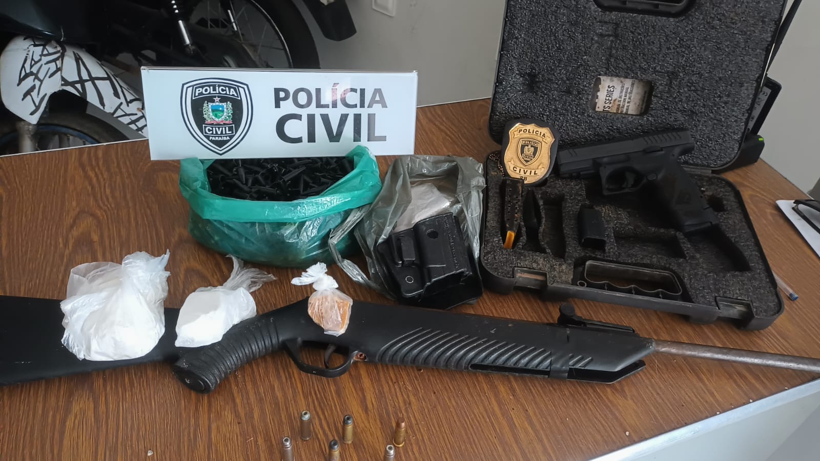 Uma ação conjunta da Polícia Civil da Paraíba, com equipes da Delegacia de São João do Cariri, do Grupo Tático Especial (GTE/14ª Delegacia Seccional) e da Polícia Militar, resultou na prisão de quatro suspeitos, na apreensão de duas armas de fogo, quase 350 munições e porções de drogas.
