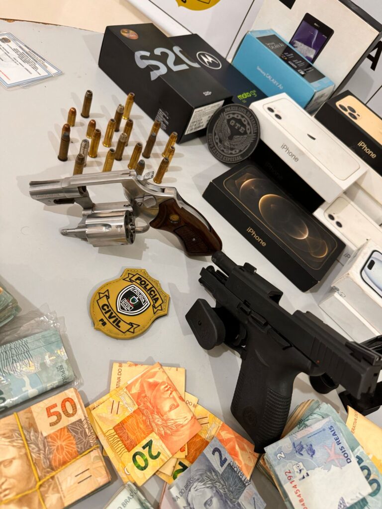 Ao todo, foram cumpridos quatro mandados de busca e apreensão domiciliar. Além da prisão de um homem em flagrante, os policiais apreenderam aparelhos celulares, um revólver, uma pistola e a quantia de R$ 118.000,00 (cento e dezoito mil reais) em espécie.