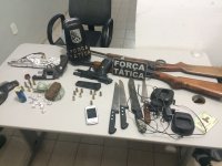 Com os mesmos foram apreendidos os seguintes objetos: Pistola calibre .40, número SMK 27702; Revólver Taurus calibre 38, número 342640; Espingarda Calibre 12 Boito, número 692297; Quatro cartuchos de calibre 12, Um estojo de calibre 12; Seis munições de calibre 38; Dez munições de calibre .40; Doze papelotes de maconha; Tablete prensado de maconha; Dois acarregadores de HT; Quatro celulares; Quatro facas; Motocicleta Honda Bros, cor vermelha, placa NQC 5750; Motocicleta Honda Titan preta, placa OFG 8489; Uma bicicleta.