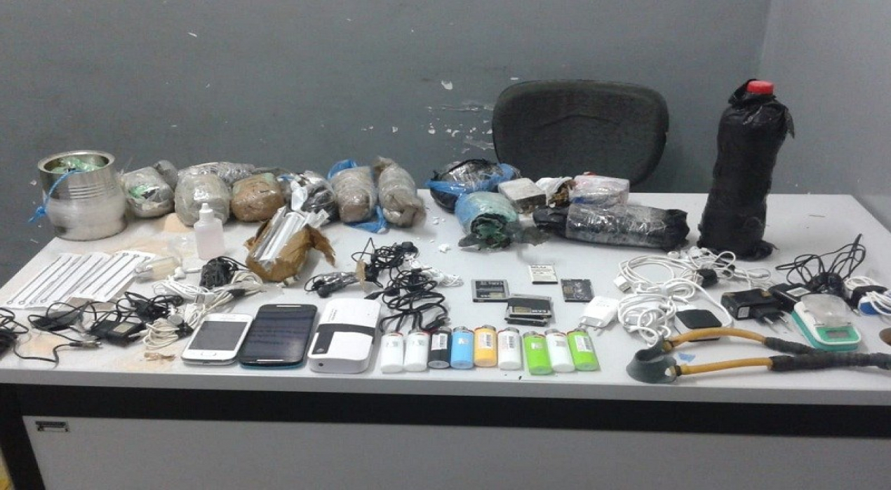 Com eles foram encontrados sete pacotes de maconha, oito carregadores de celular, nove fones de ouvido, seis baterias, três celulares, uma garrafa de bebida alcoólica, 49 agulhas para tatuagem, quantidade de “loló” e uma moto.