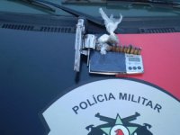 Os mesmos foram encontrados dentro de sua residência portando uma arma de fogo, Cal. 38, inoxidável, várias munições, uma balança de precisão e ainda uma pequena quantidade de drogas.