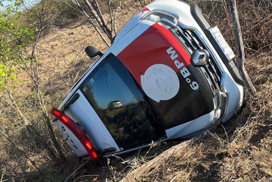Um pneu estourado fez com que uma viatura da Polícia Militar da Paraíba tombasse fora da pista na PB-393, no Sertão da Paraíba. O acidente aconteceu na tarde desta sexta-feira (10) entre os municípios de Santa Helena e São João do Rio do Peixe.