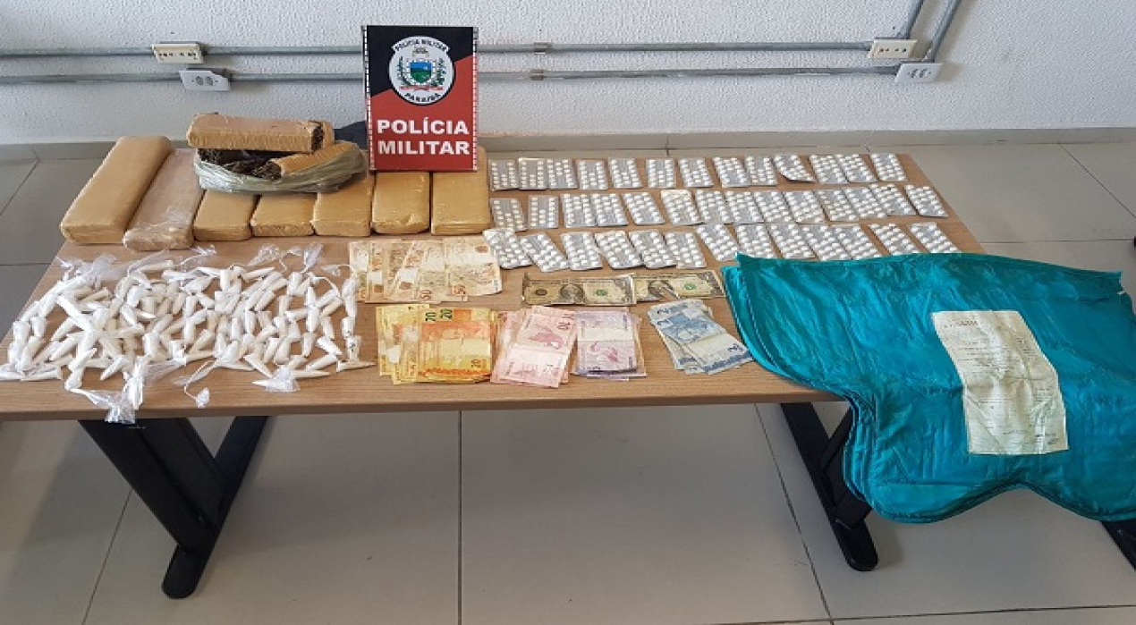 A maconha estava dividida em 7 tabletes grandes e em mais 4 de tamanhos menores. 120 pinos de cocaína e 40 cartelas com comprimidos artane também foram apreendidos pelos policiais. A PM localizou ainda mais de R$ 800,00 e dois dólares. Todo o material e os suspeitos presos foram levados para a Central de Flagrantes, no bairro do Ernesto Geisel.