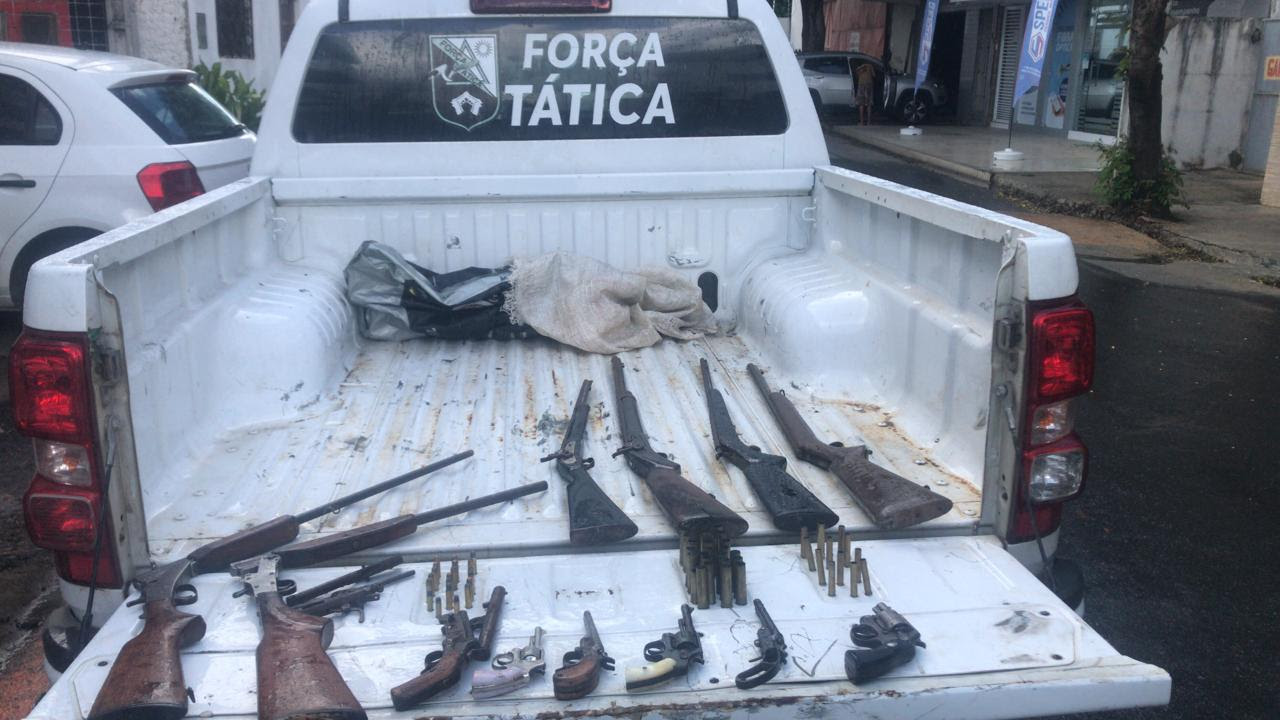 Doze armas de fogo foram apreendidas, nessa quinta-feira (4), através de um trabalho preventivo da Força Tática da 3ª Companhia Independente da PM (3ª CIPM), na cidade de Aroeiras. O arsenal era composto por revólveres e espingardas. Dois homens foram presos em flagrante.