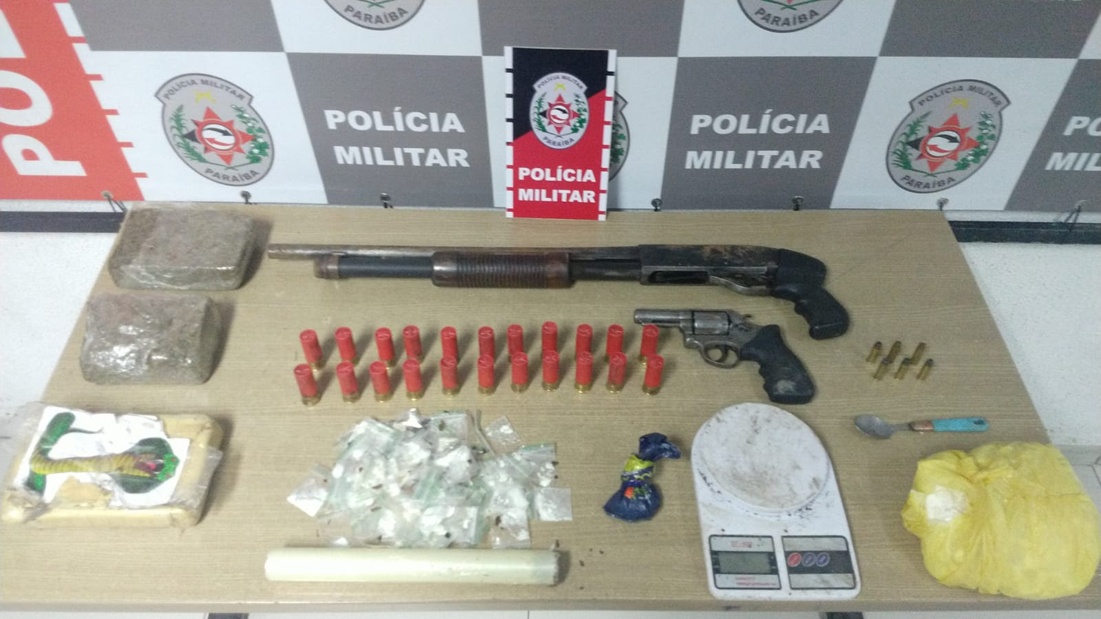 A Polícia Militar apreendeu uma escopeta calibre 12, munições de quatro calibres diferentes e embalagens com cocaína, crack e maconha, na noite desse sábado (21), durante as atividades de reforço da segurança na região central de João Pessoa. O material estava escondido perto de uma mata, no bairro do Tambiá, e foi localizado por meio de denúncia anônima.