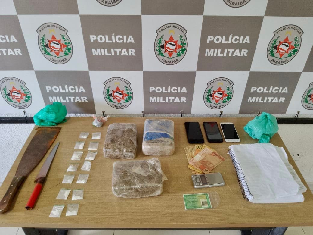 Dois suspeitos, de 28 e 14 anos, foram detidos em flagrante com três tabletes grandes de maconha, 14 papelotes de cocaína, balança de precisão, caderno com anotações do tráfico e dinheiro, na manhã desta quarta-feira (25), no Colinas do Sul, no bairro de Gramame, em João Pessoa.